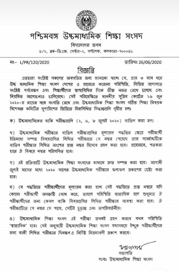 ভারত নিউজ- জুলাইয়ের প্রথমে উচ্চমাধ্যমিকের বাকি পরীক্ষাগুলি হওয়ার কথা ছিল কিন্তু সেগুলো হচ্ছেনা। শিক্ষামন্ত্রী পার্থ চট্টোপাধ্যায় আজ জানান মূল্যায়ন কিভাবে হবে সেটা পরে জানানো হবে। ঐ পরীক্ষাগুলি বাতিল করা হলো। আদালতের নির্দেশের উপর ভিত্তি করে সিদ্ধান্ত নেওয়া হয়েছে। উল্লেখ্য, ইংরেজি মাধ্যম বোর্ডগুলির উচ্চ