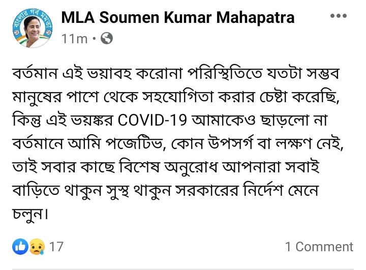 জানান মহামারী ও লকডাউনের দিনগুলিতে যতটা সম্ভব মানুষের পাশে থেকেছি । কিন্তু ভয়ঙ্কর কোভিড – 19শেষ পর্যন্ত আমাকেও ছাড়লোনা। উল্লেখ্য , রাজ্যে বা দেশে জনপ্রতিনিধিদের আক্রান্ত হওয়ার হার বাড়ছে । মূলত , প্রশাসনিক কারণে ও জন সংযোগের জন্য বিভিন্ন জায়গায় তাদের যেতে হয় এটা একটা গুরুত্বপূর্ণ কারণ হতে পারে । আপাতত সৌমেনবাবু তাঁর পাঁশকুড়ার বাড়িতেই হোম আইসোলেশনে রয়েছেন ।