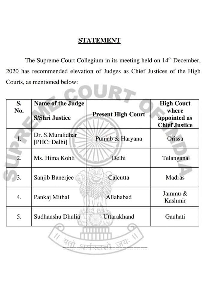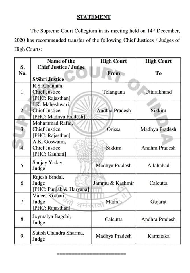আজ সুপ্রিম কোর্টের কলেজিয়াম বৈঠকে বড় সিদ্ধান্ত গৃহীত হলো । বেশ কয়েকটি হাইকোর্টের বিচারপতি পরিবর্তন করা হচ্ছে । এর মধ্যে খবর পাওয়া গেছে কলকাতা হাইকোর্টের দুইজন বিচারপতিকে অন্যত্র ট্রান্সফার করা হচ্ছে । এদের মধ্যে সবচেয়ে উল্লেখযোগ্য হলো বর্তমানে ডিএ মামলা রিলেটেড ডিভিশন বেঞ্চের সিনিয়র বিচারপতি সঞ্জীব বন্দ্যোপাধ্যায়কে ট্রান্সফার করে দেওয়া হচ্ছে মাদ্রাজ হাইকোর্টে । বিচারপতি সঞ্জীব বন্দ্যোপাধ্যায়কে মাদ্রাজ হাইকোর্টের প্রধান বিচারপতি পদে নিয়োগের প্রস্তাব গৃহীত হয়েছে । এরফলে ভবিষ্যতে ফের ডিএ মামলায় বিলম্ব হওয়ার সম্ভাবনা রয়েছে । কলকাতা হাইকোর্টের অন্য আর এক বিচারপতি জয়মাল্য বাগচীকে ট্রান্সফার করে দেওয়া হচ্ছে অন্ধ্রপ্রদেশ হাইকোর্টে ।