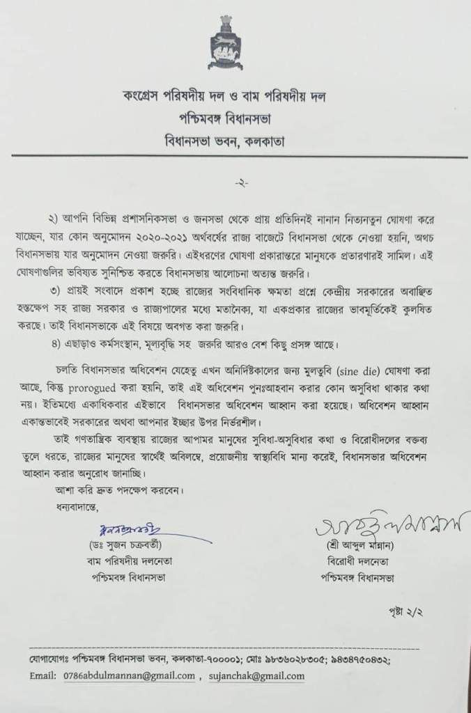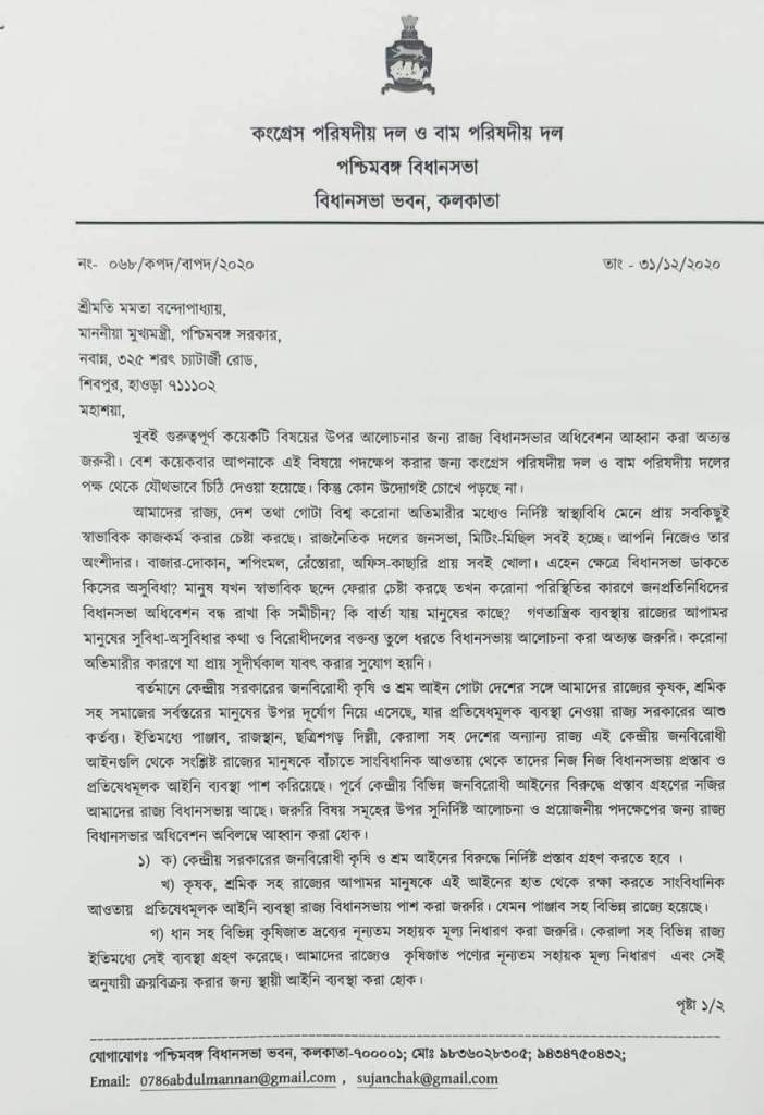 রাজ্যের বিভিন্ন গুরুত্বপূর্ণ বিষয়ে আলোচনার জন্য বিধানসভার অধিবেশন ডাকার জন্য রাজ্যের মুখ্যমন্ত্রীর কাছে আবেদন জানাল বাম পরিষদীয় দল ও কংগ্রেস পরিষদীয় দলের পক্ষ থেকে সুজন চক্রবর্তী ও আবদুল মান্নান । চিঠিতে তাঁরা উল্লেখ করেছেন মহামারী পরিস্থিতিতে যেহেতু পরিস্থিতির সঙ্গে লড়াই করে সমস্ত কিছু স্বাভাবিক চলছে সেহেতু বিধানসভার অধিবেশন আহ্বান করা হোক । তাঁরা আরো বলেন কৃষকের স্বার্থে রাজ্যের আইন চাই। কৃষিপন্যের ন্যুনতম দামের গ্যারান্টি চাই ।