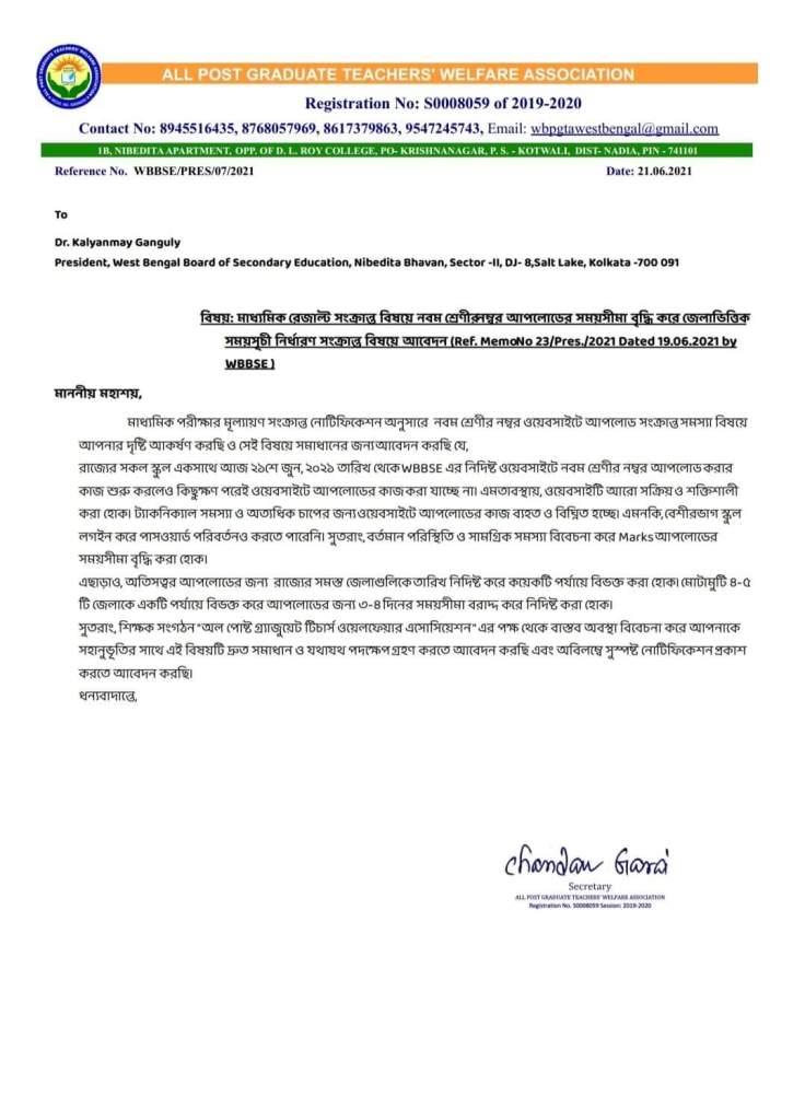 নবম শ্রেণীর নম্বর আপলোডের সময়সীমা বৃদ্ধি করে জেলাভিত্তিক স্লট বিভক্ত করে সময়সূচী নির্ধারণ সংক্রান্ত বিষয়ে পর্ষদ সভাপতিকে আবেদন জানালো পোস্ট গ্র্যাজুয়েট শিক্ষকদের একটি সংগঠন । অনেক শিক্ষক এবং প্রধান শিক্ষক বলেন খুব অল্প সময়ের মধ্যে কয়েক হাজার স্কুল রেজাল্ট আপলোড করার চেষ্টা করায় সার্ভার বসে যাচ্ছে তাই অনেক স্কুল চেষ্টা করেও আপলোড করতে পারছেনা ফলাফল ।
