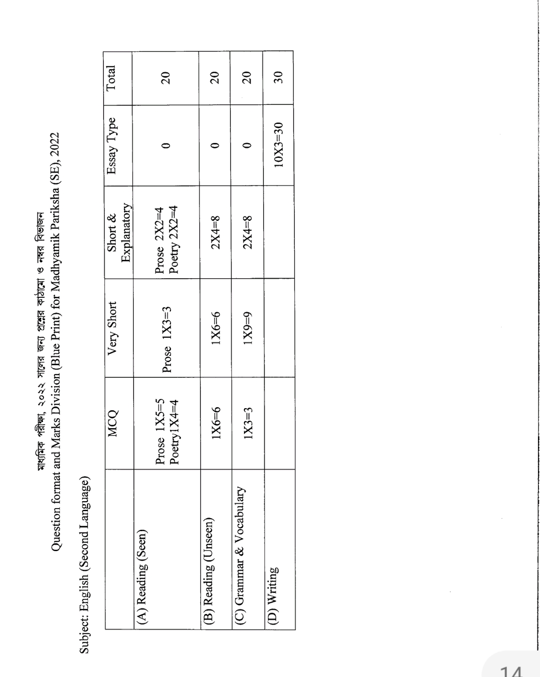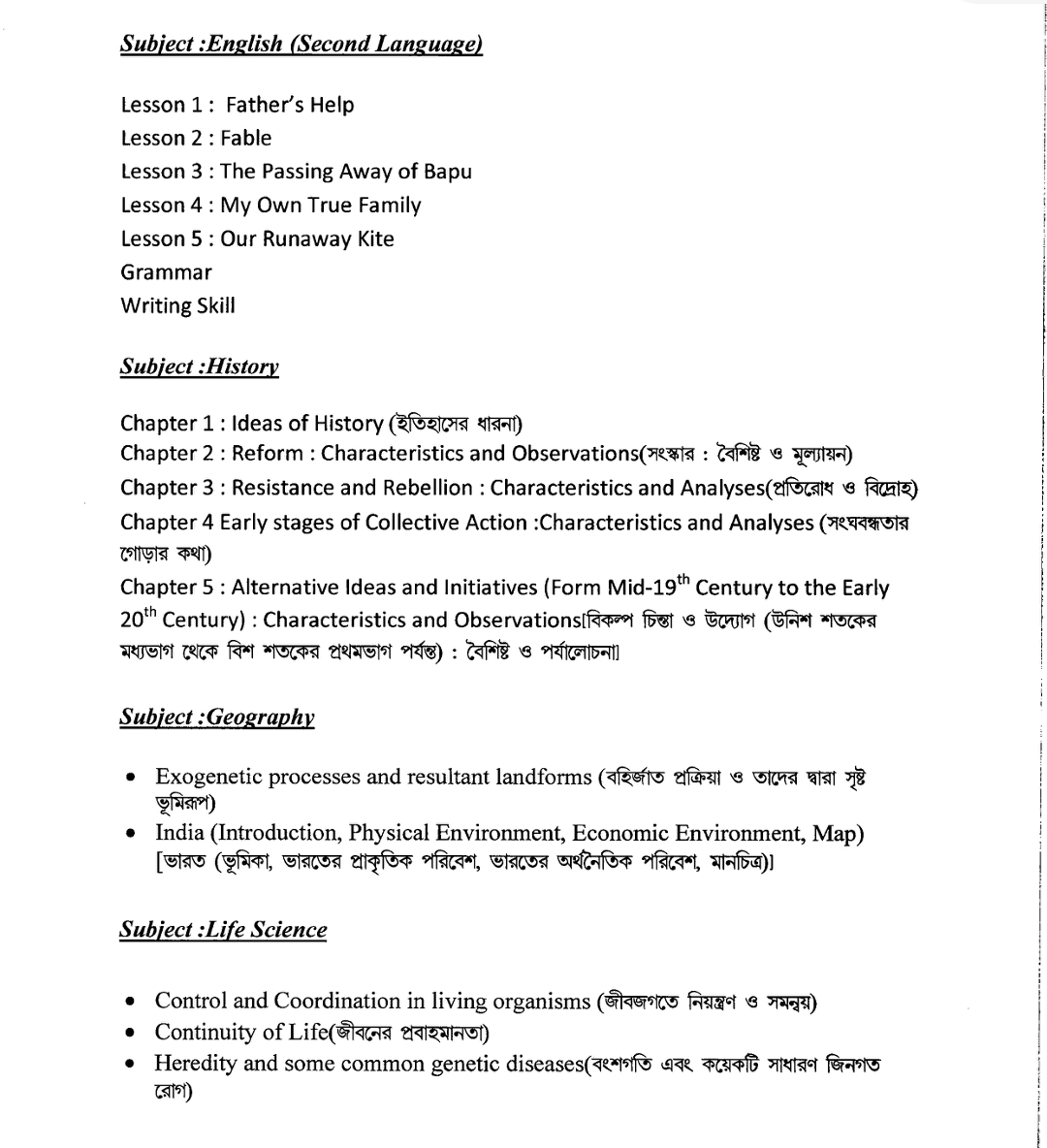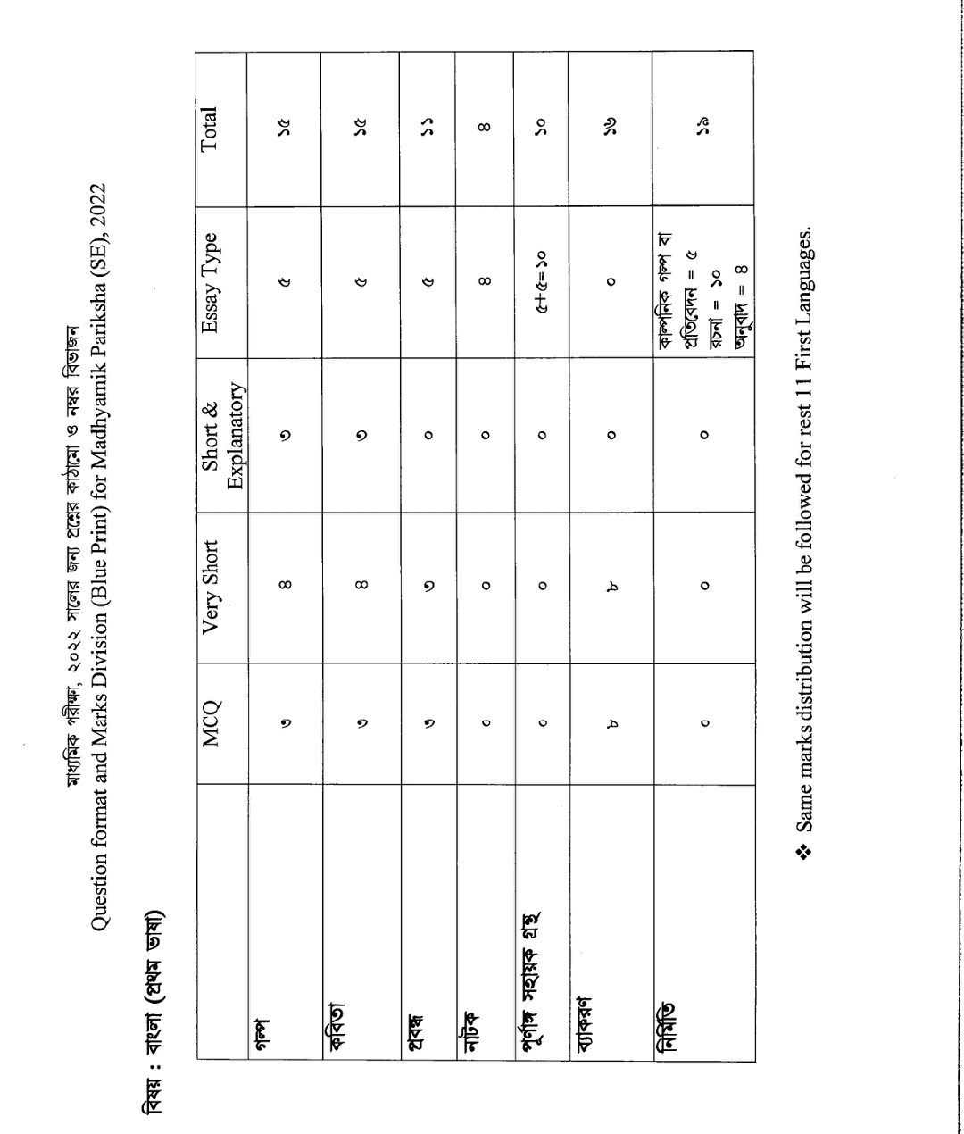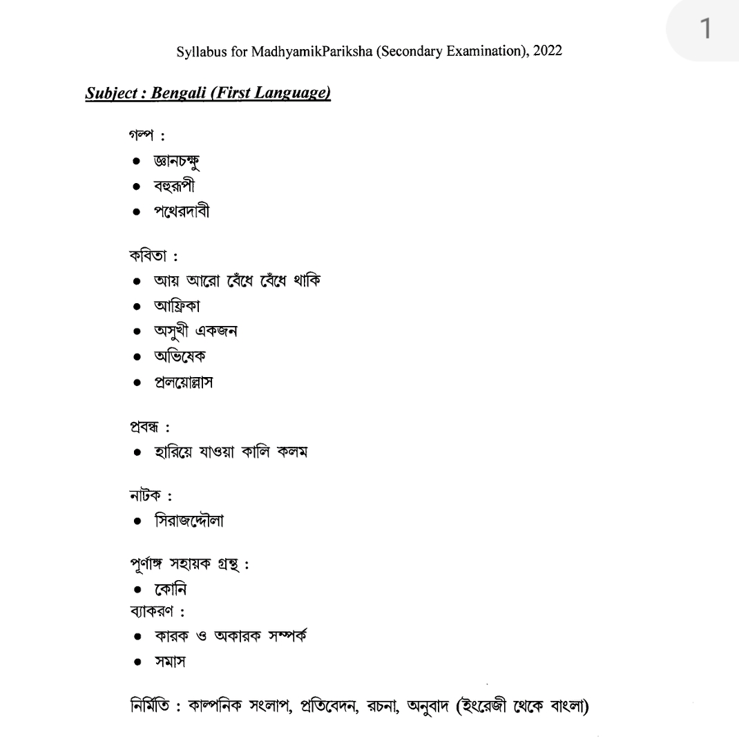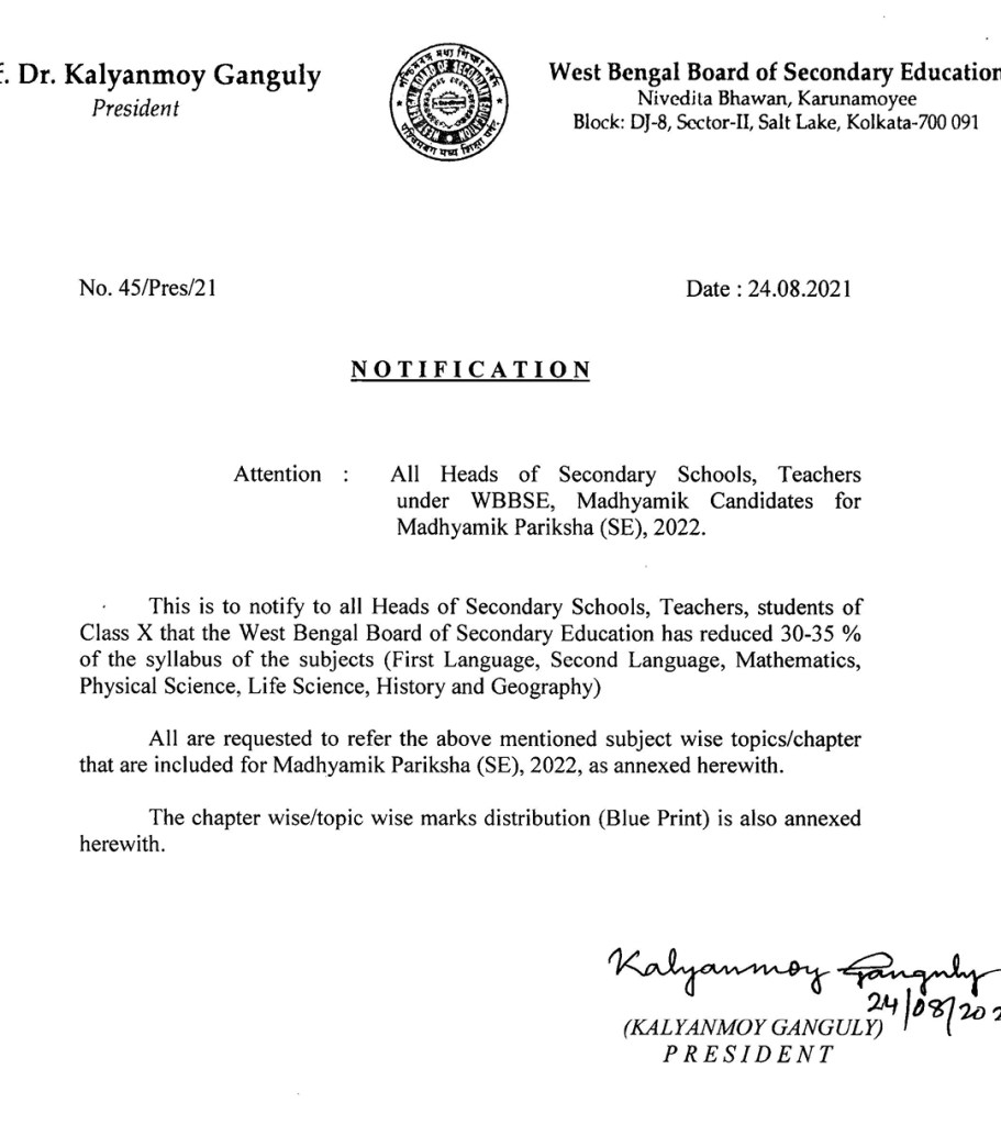 মাধ্যমিক – ২০২২এর সংক্ষেপিত সিলেবাস ও প্রশ্নের ব্লু-প্রিন্ট প্রকাশিত হল । মধ্যশিক্ষা পর্ষদ এর পক্ষ থেকে প্রকাশ করা হয় । স্বাভাবিক সিলেবাসের থেকে কিছুটা সংক্ষিপ্ত করা হয়েছে । পুজোর আগে পঠন-পাঠন শুরু হওয়ার কোন সম্ভাবনা নেই সেই কারণেই সিলেবাস কিছুটা কমানো হয়েছে । কোন বিষয়ে কটা চ্যাপ্টার বা অধ্যায় পরীক্ষা হবে , কোন অধ্যায় থেকে কত নম্বরের প্রশ্ন আসবে তার একটা রূপরেখা প্রকাশ করা হয়েছে যা বিষয়ভিত্তিক নিচে দেওয়া হল । বাংলা ,ইংরেজি, ইতিহাস, ভূগোল, জীবন বিজ্ঞান ,পদার্থ বিজ্ঞান, গণিত সমস্ত বিষয়ের সিলেবাস প্রকাশিত হয়েছে । এছাড়া, অন্যান্য আঞ্চলিক ভাষার সিলেবাসও প্রকাশ করা হয়েছে । মধ্যশিক্ষা পর্ষদের সভাপতি কল্যাণময় গঙ্গোপাধ্যায় আগামী বছর মাধ্যমিক পরীক্ষার সিলেবাস সংক্রান্ত এক বিজ্ঞপ্তি জারি করেছেন যেটাতে তিনি উল্লেখ করেছেন প্রতি বিষয়ে ৩০ থেকে ৩৫ শতাংশ সিলেবাস হ্রাস করা হয়েছে ।